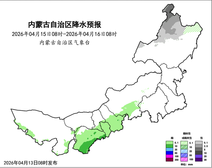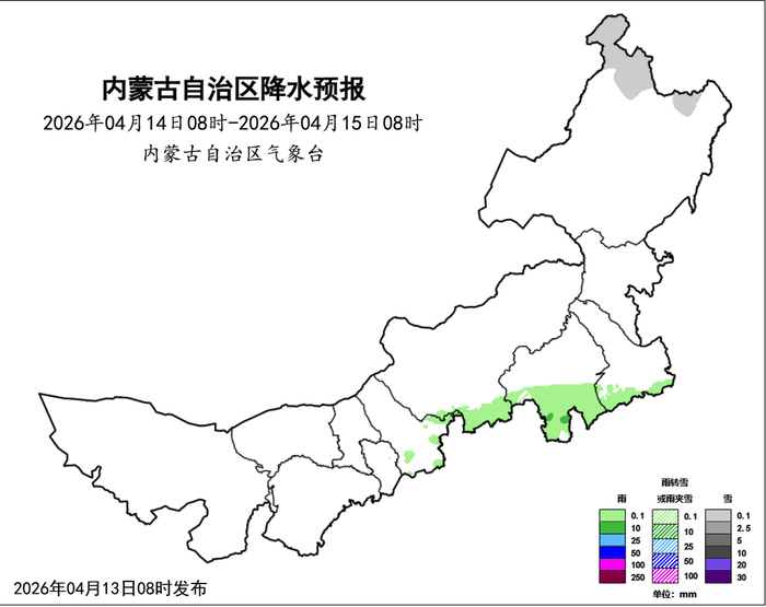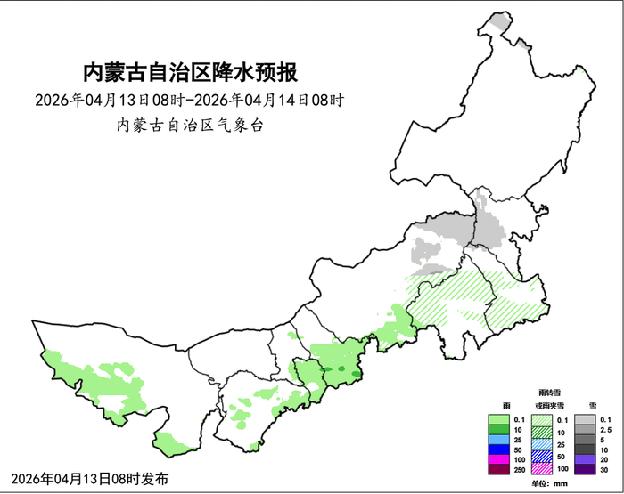 昨天降水主要出现在呼伦贝尔市、鄂尔多斯市、呼和浩特市。据监测显示,12日08时-13日08时,全区6个盟市35个旗县的162个站点出现降水,范围0.1~3.9毫米。中雪,1个旗县1个站点出现,为呼伦贝尔市海拉尔区哈克镇谢尔塔拉2.6毫米。小雪,12个旗县65个站点出现,其中,呼伦贝尔市陈巴尔虎旗宝日希勒2.1毫米、鄂温克族自治旗辉苏木乌兰托格2.1毫米、海拉尔区2.1毫米。小雨夹雪或雨转雪,11个旗县28个站点出现,其中,呼伦贝尔市牙克石市乌奴尔镇兴安岭3.5毫米、库都尔2.7毫米,鄂伦春自治旗古里2.0毫米。小雨,24个旗县68个站点出现,其中,鄂尔多斯市鄂托克旗苏米图苏木查干陶勒盖3.9毫米,呼和浩特市清水河县韭菜庄2.0毫米,锡林郭勒盟正镶白旗明安图镇巴彦宝拉格1.9毫米。