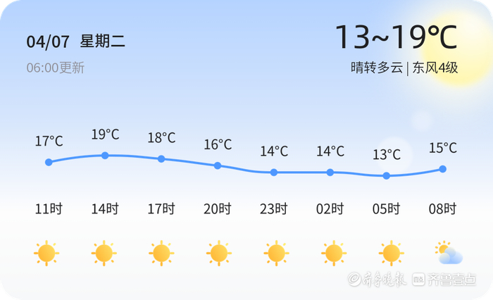 今天是4月7日(二月二十),星期二。济南市今日天气晴转多云,东风4级,气温13℃至19℃。目前空气质量状况为良(PM2.5指数75),适合市民外出活动。但由于风力较大,建议市民外出时注意防范高空坠物,尽量远离广告牌和大树,以免发生意外。早晨的气温较低,市民出行时需注意保暖,建议穿着轻薄外套,中午时段温度上升,可适当减少衣物。同时,风干物燥,市民需注意用火用电安全,防止火灾发生。今天的空气湿度为49%,较为干燥,市民可适当补充水分,保持身体水分平衡。
